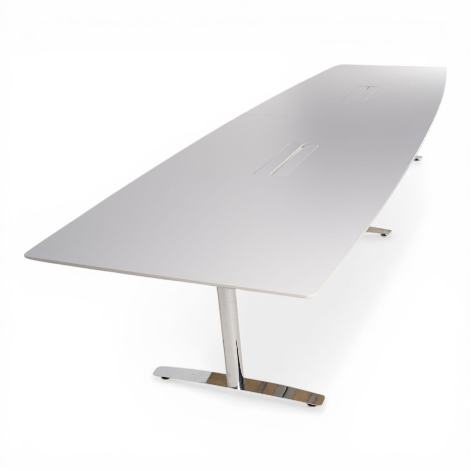 Dette møtebordet er designet for profesjonelle arbeidsmiljøer hvor funksjonalitet og estetikk går hånd i hånd. Bordet har en grå bordplate og et robust kromunderstell som gir et moderne og tidløst uttrykk. To integrerte kabelgjennomføringer sikrer ryddig kabelføring og en oversiktlig arbeidsplass.