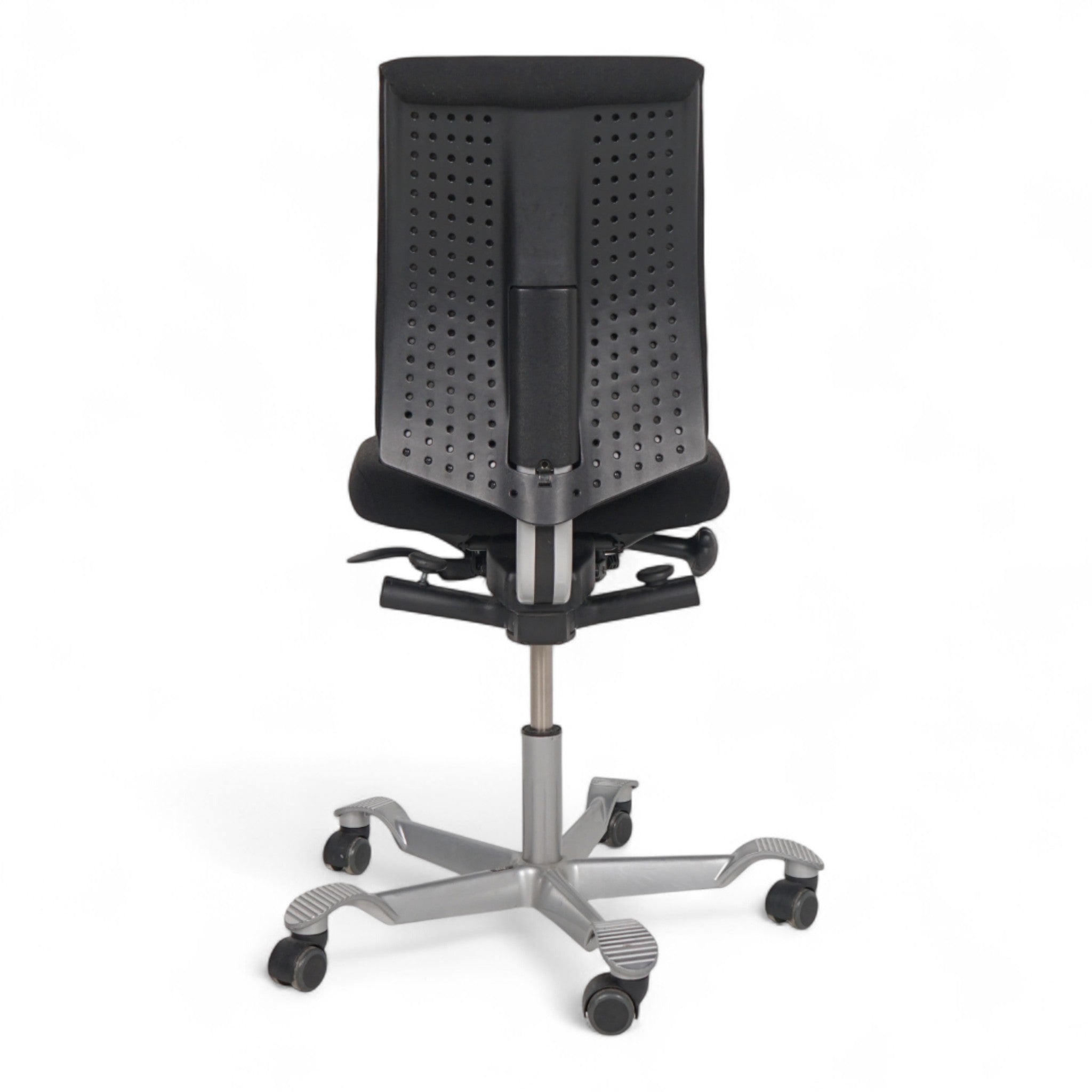 Denne brukte kontorstolen fra HÅG modell H05 5300 er en praktisk og komfortabel løsning for kontoret. Stolen har et behagelig trekk på sete og rygg i sort stoff som gir god støtte gjennom arbeidsdagen.