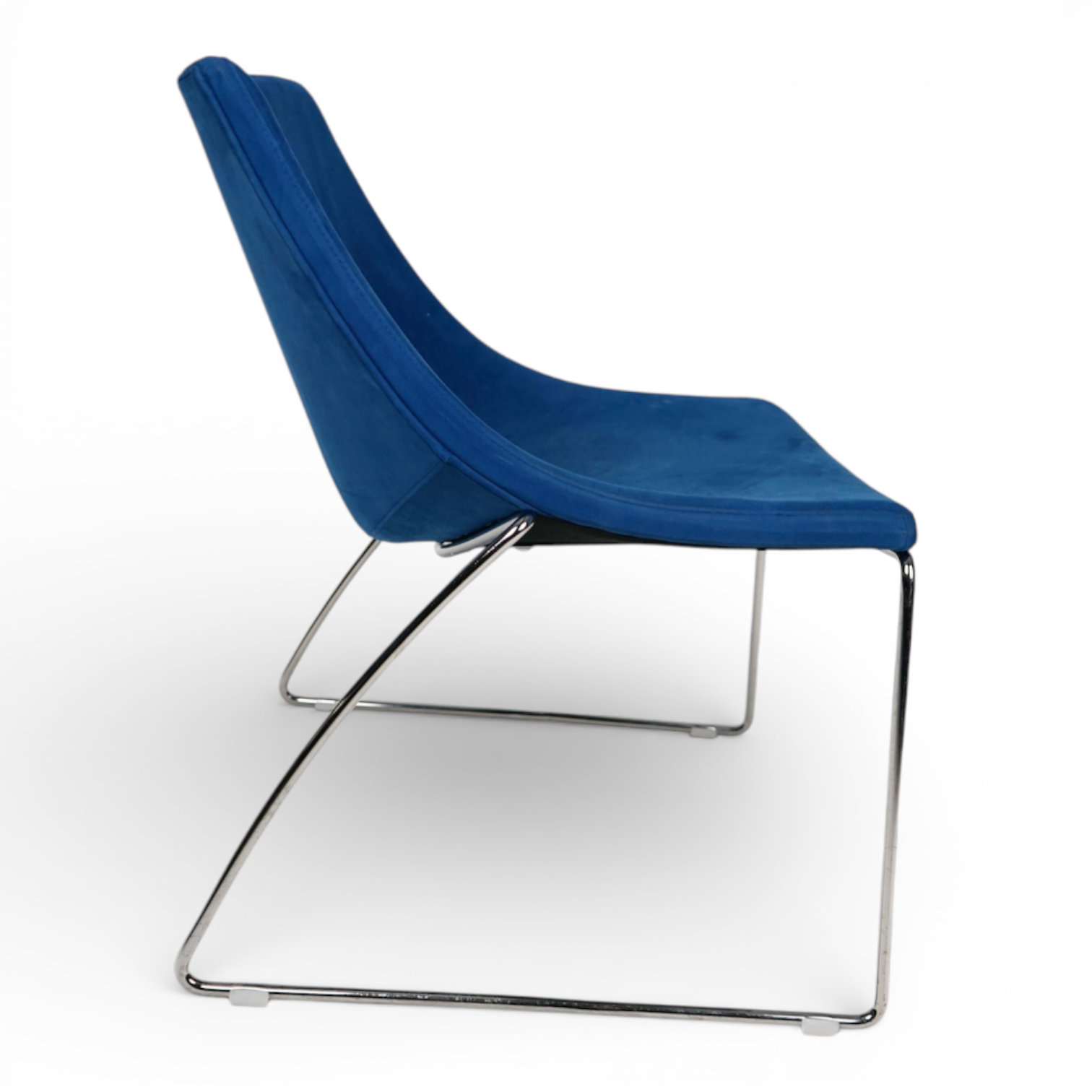 Loungestol fra Scan Sørlie i en delikat blåtone. Stolene har et semsket stoff som bærer noe preg av slitasje og som bør renses. Eventuelt er disse et strålende objekt for å bli trukket om med Sinde fine linjer og behagelige komfort.