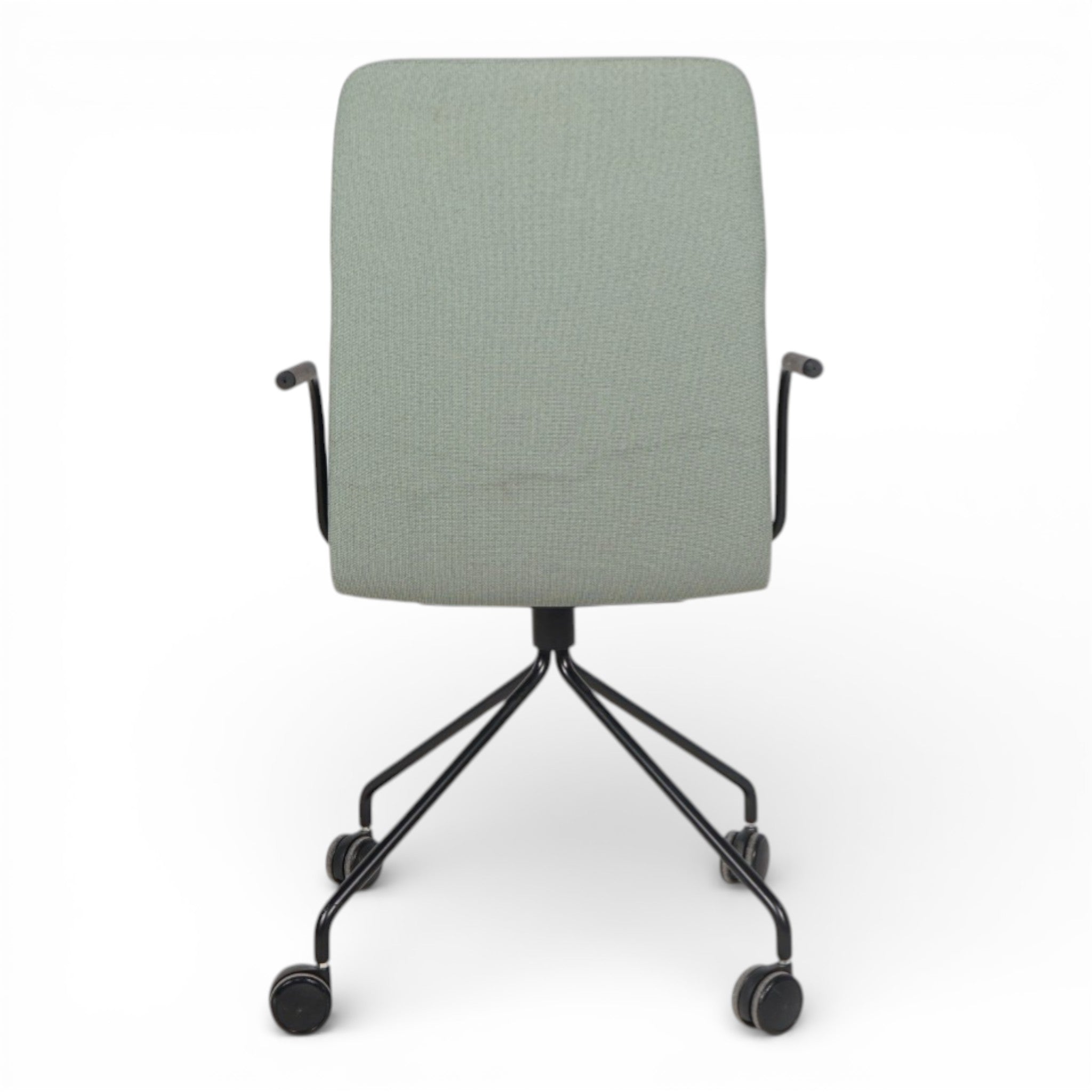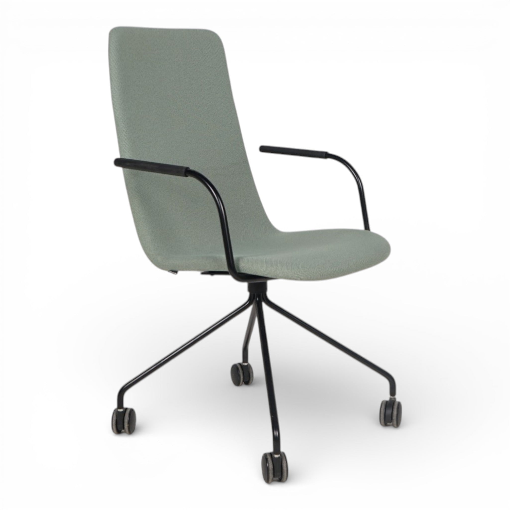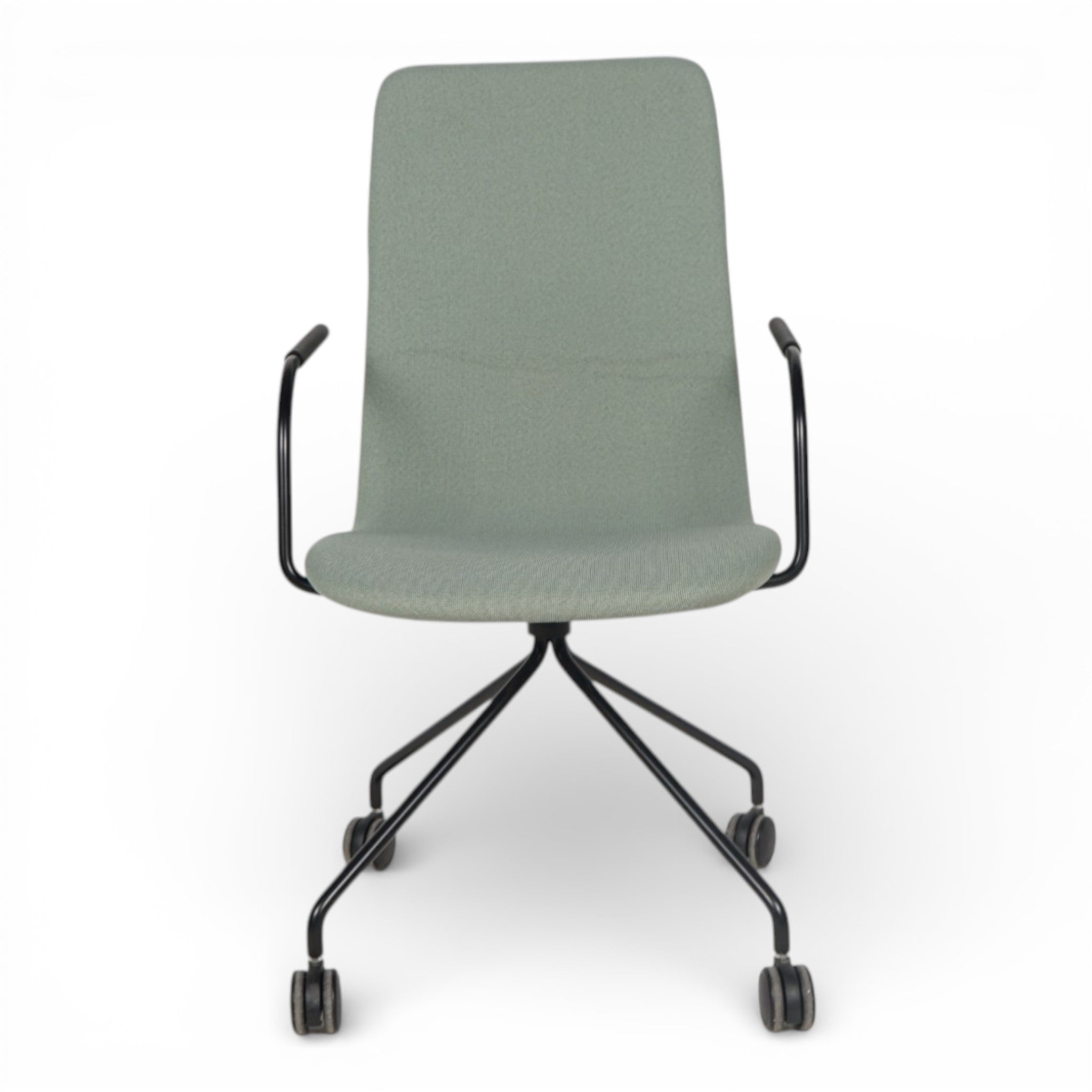 Konferansestol fra martela med grønt stoff, sort fotkryss med hjul og armlener