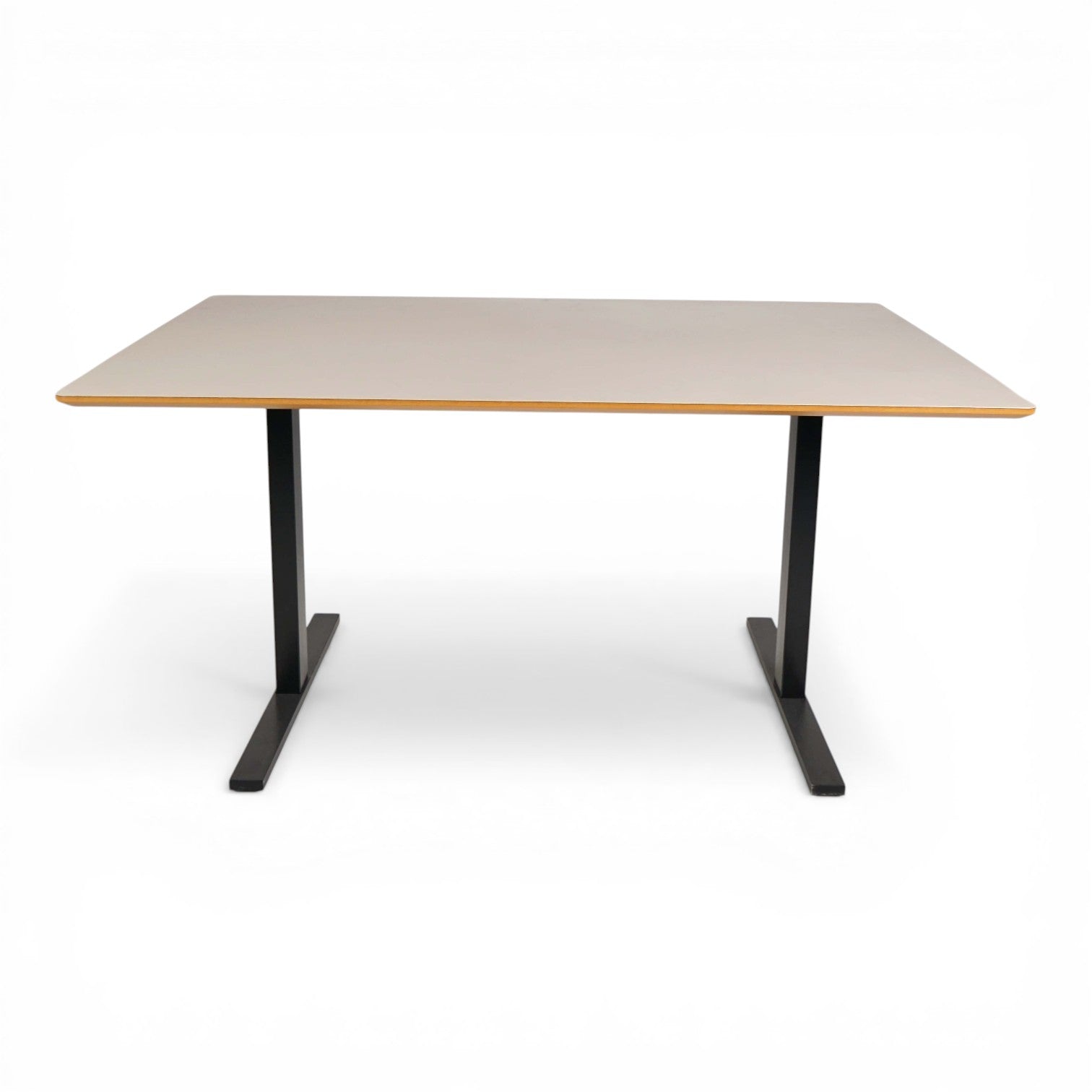 Dette møtebordet kombinerer funksjonalitet med elegant design. Den matte, beige bordplaten gir et moderne og profesjonelt uttrykk, mens de sorte bena skaper en fin kontrast. Kanten i tre tilfører varme og karakter til bordet.