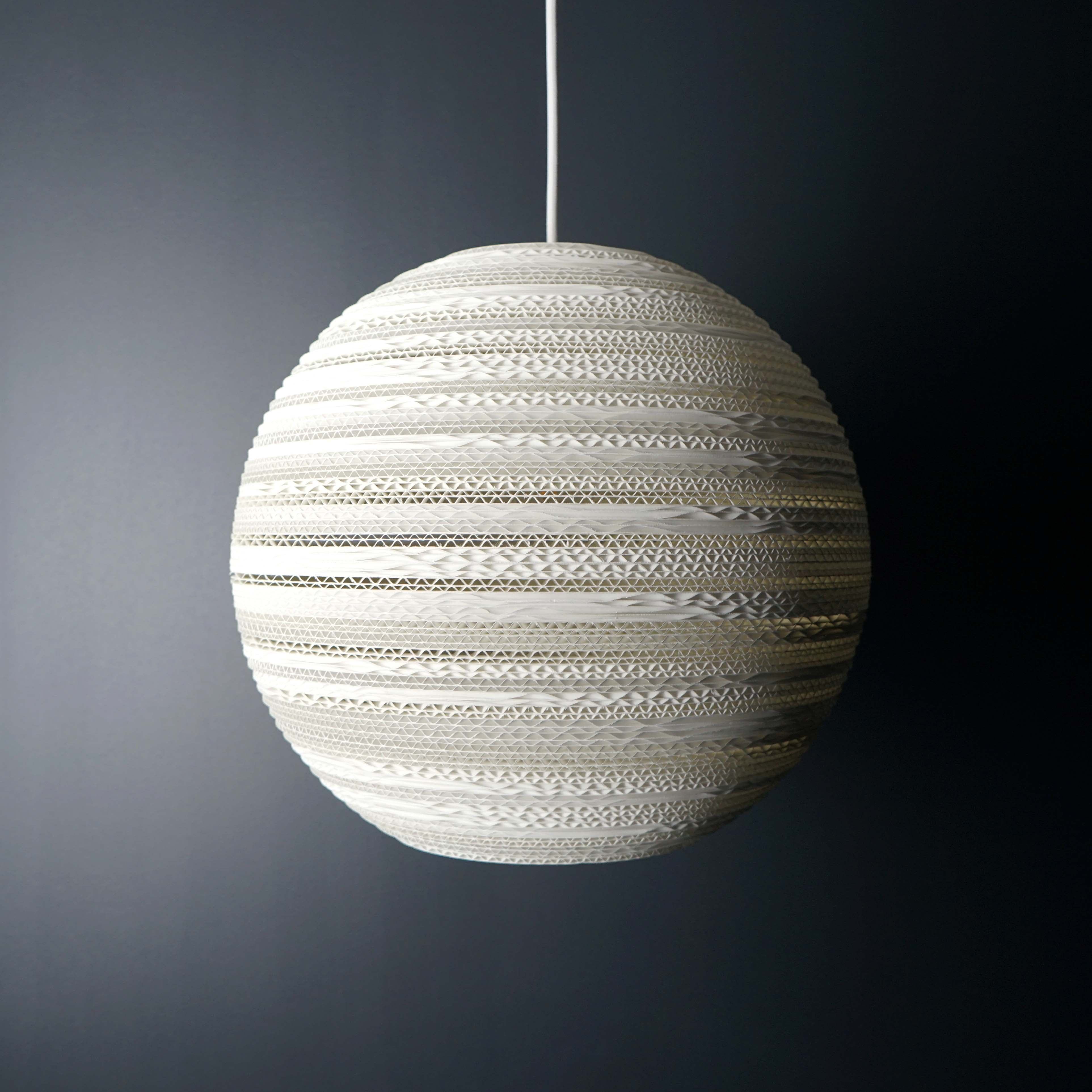 Lampen er laget av resirkulert papp og skaper et varmt, diffust lys som gir en koselig atmosfære til ethvert rom. Den runde formen og naturlige teksturen gjør den til et perfekt midtpunkt i stuen, spisestuen eller soverommet.