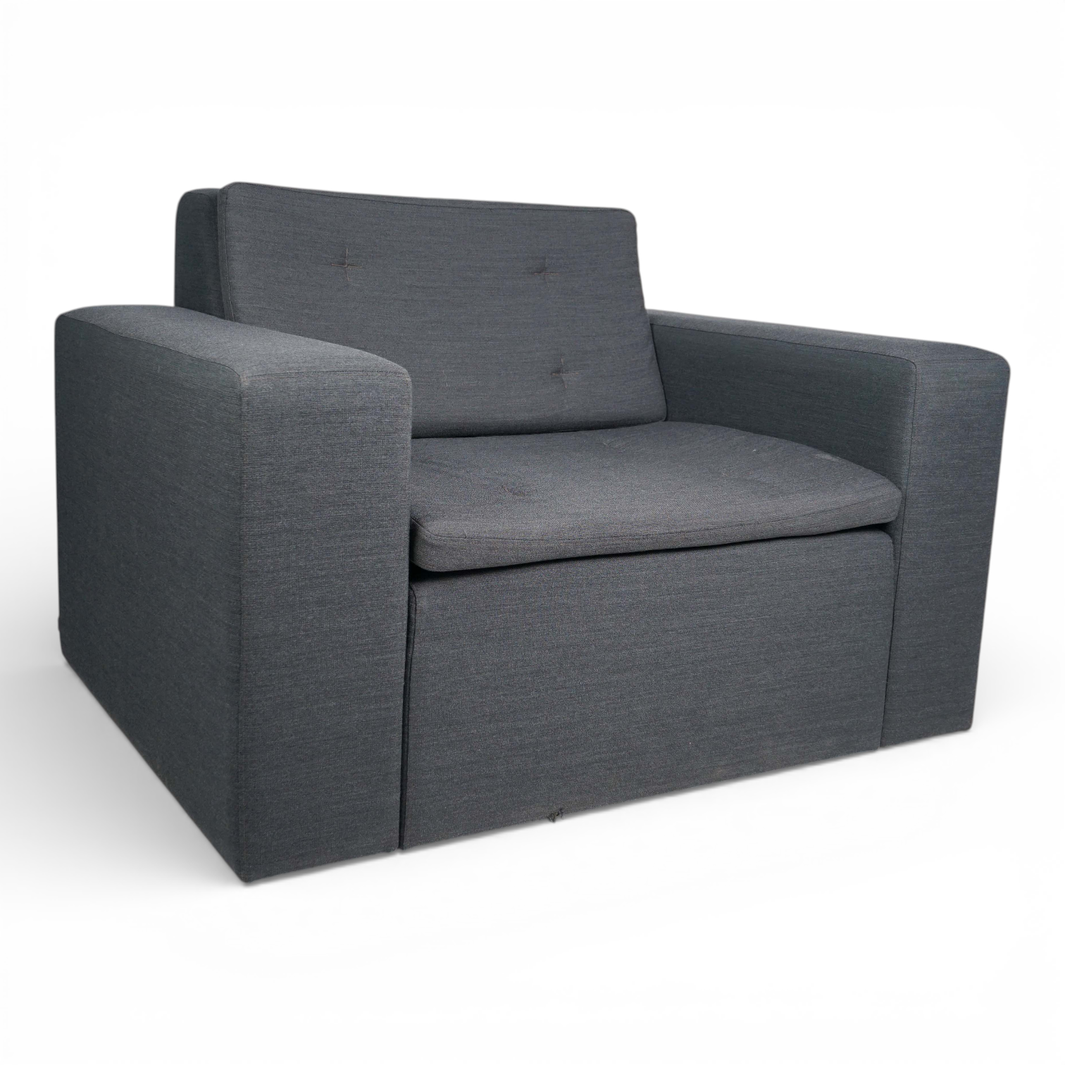 Stor og raus lenestol som tilsvarer omtrent halvannet sete. Stolene er pent brukt og i god stand. De er komfortable å sitte i, både i stolen og på armlenet. Står godt på kontorer med større plass eller som stoler til en hjemmekino.