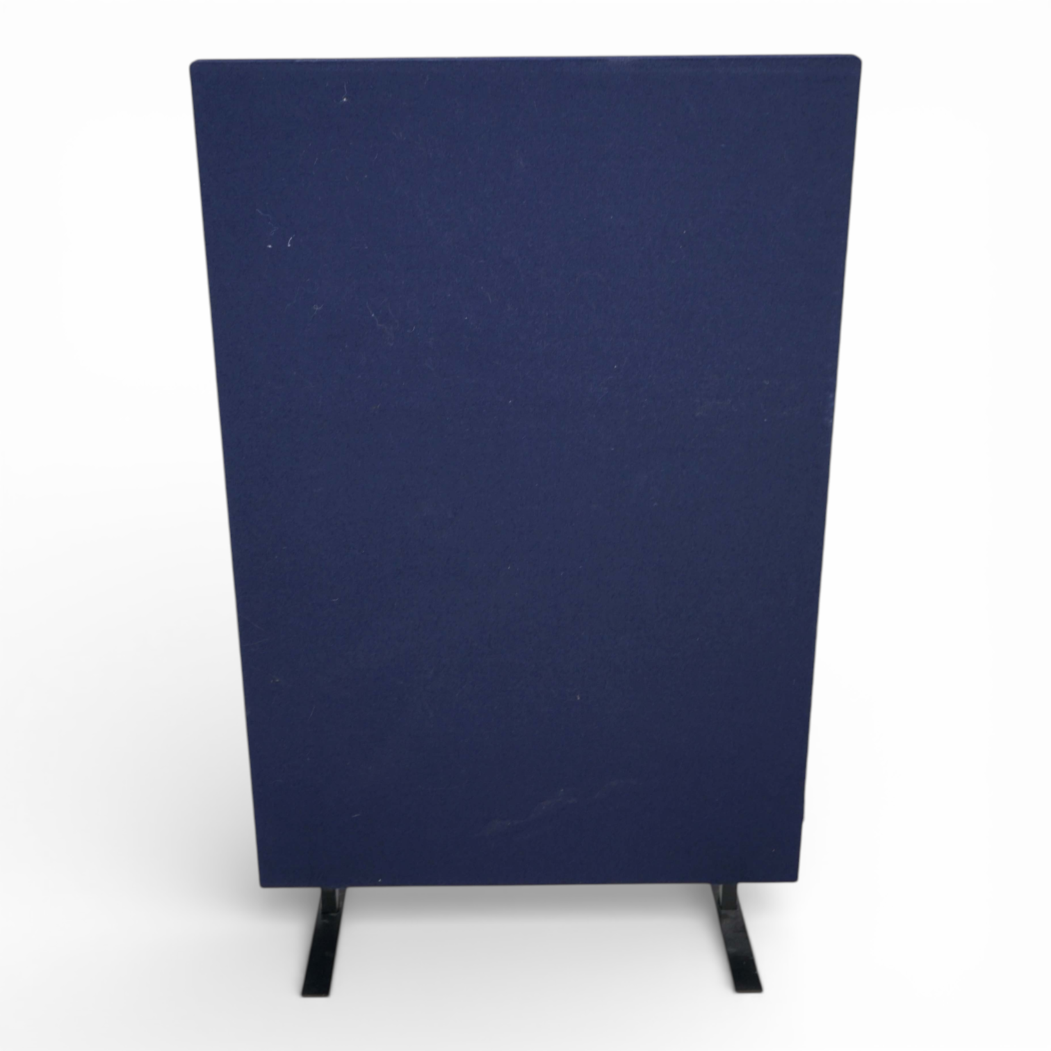 Gulvstående skillevegg i en dypblå farge. Trukket i et filtliknende stoff som gjør at den både skjermer og demper lyd. Veggen passer fint på kortenden av et bord, for eksempel, da veggens bredde tilsvarer en av de mest vanlige dybdene på skrivebord. Dette fjerner behovet for bordmonterte skillevegger, og vil med det være kostnadsbesparende da man kun trenger én vegg mellom to bord.