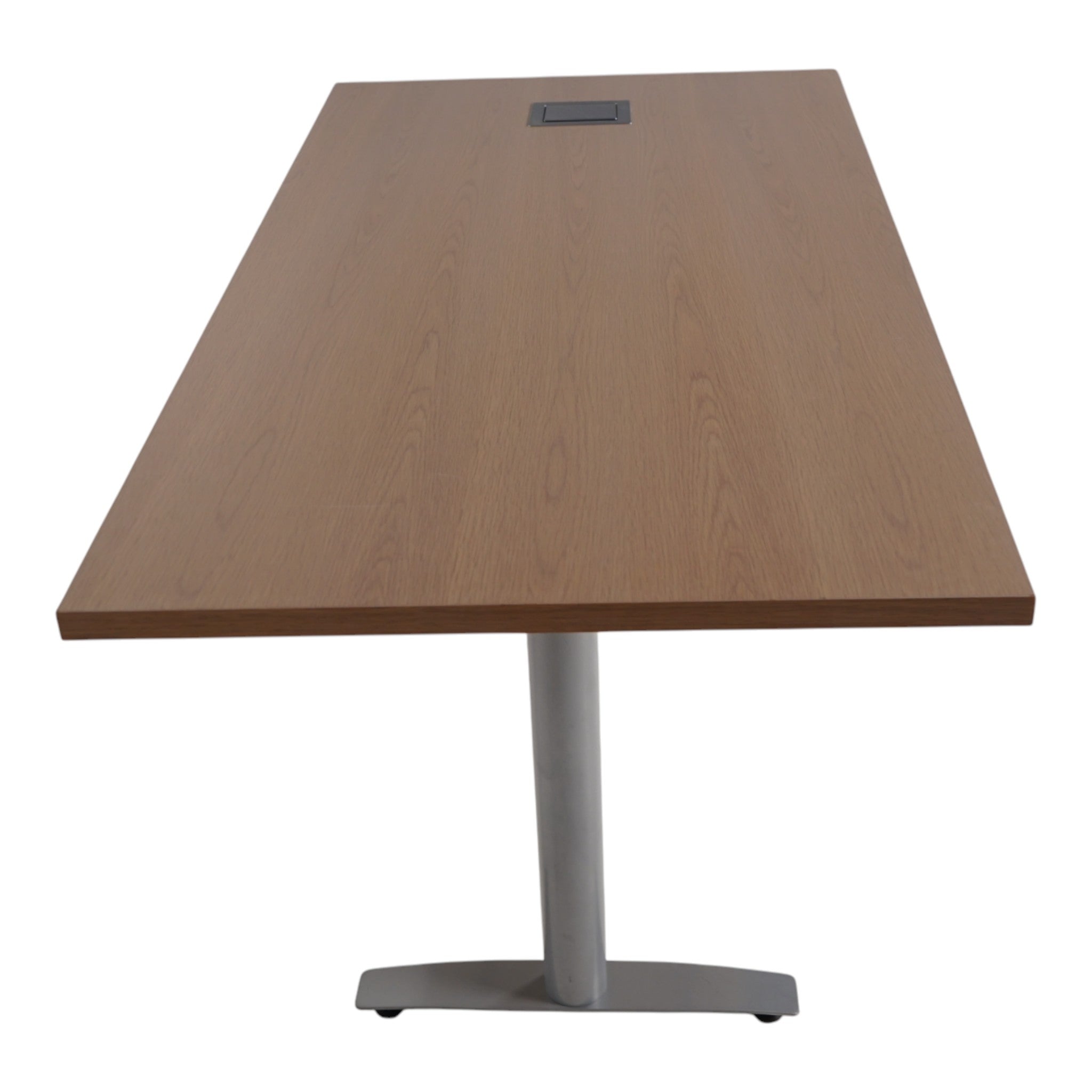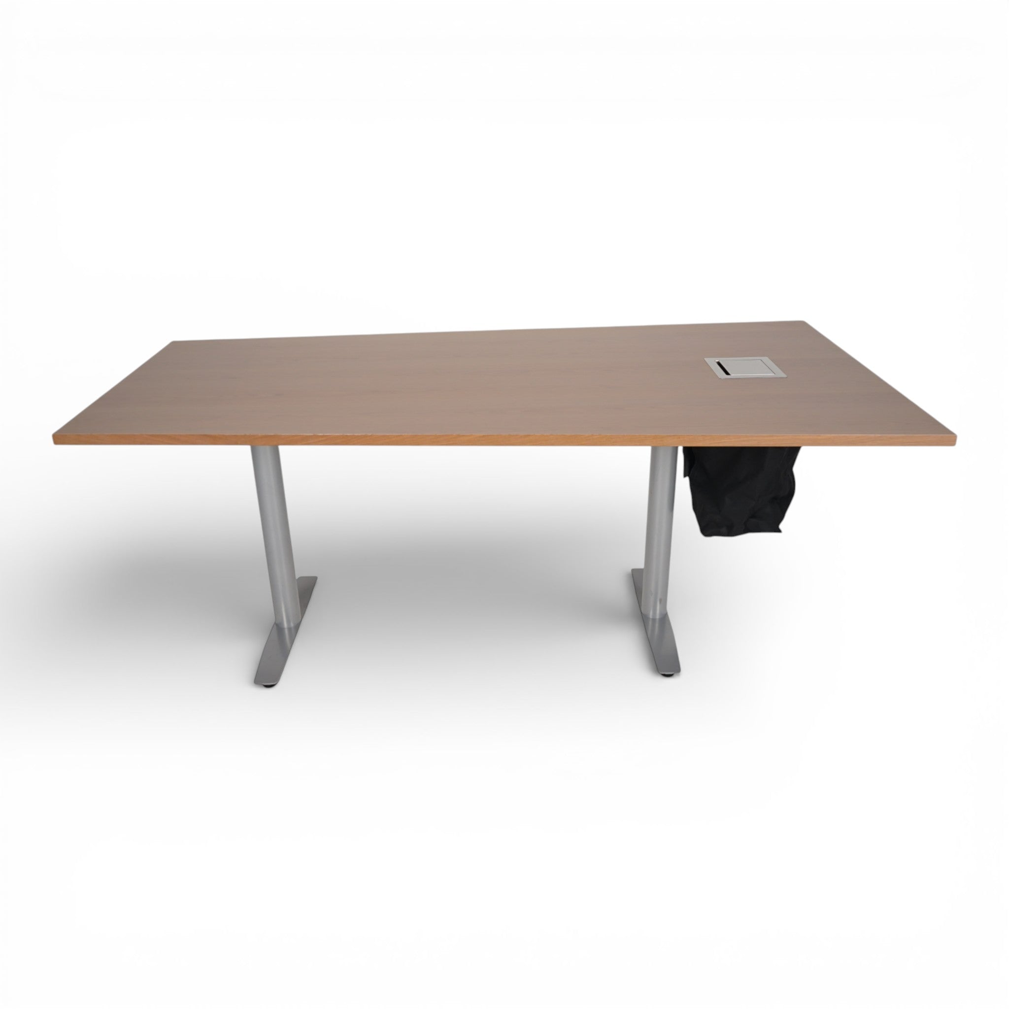 Dette trapesformede møtebordet i eik kombinerer funksjonalitet med praktisk design. Med integrert luke får du enkel tilgang til strøm og kabler, noe som gjør bordet perfekt for moderne møterom hvor teknologi er en viktig del av arbeidsdagen.