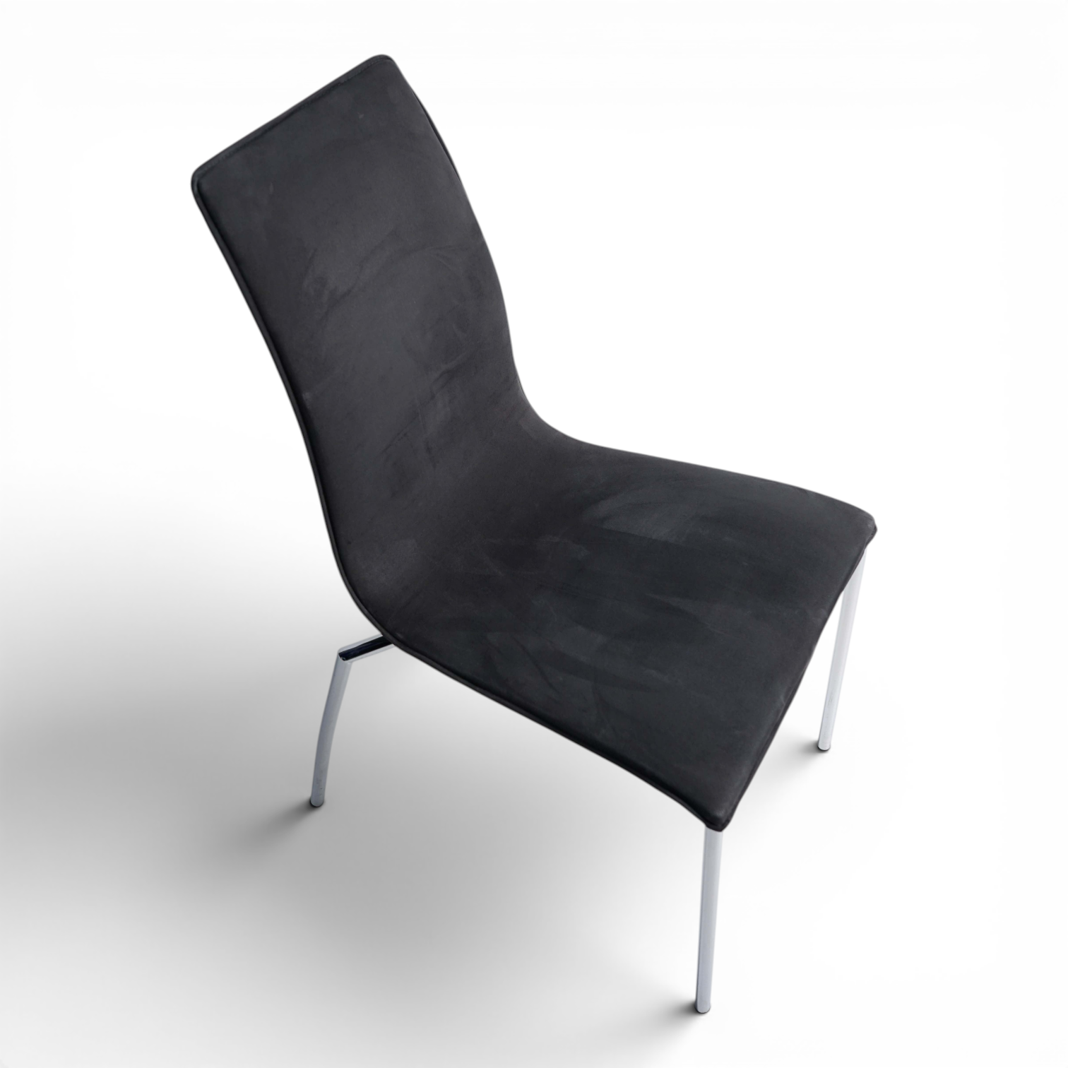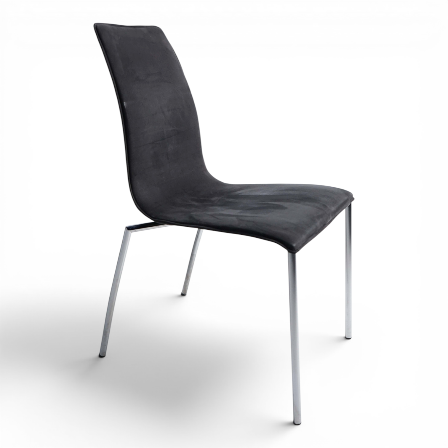 Møteromsstol fra Fora Form med semsket, grått trekk. Stolene er polstret i sete og rygg, og er med det også behagelige ved bruk. Stolen kan stables.