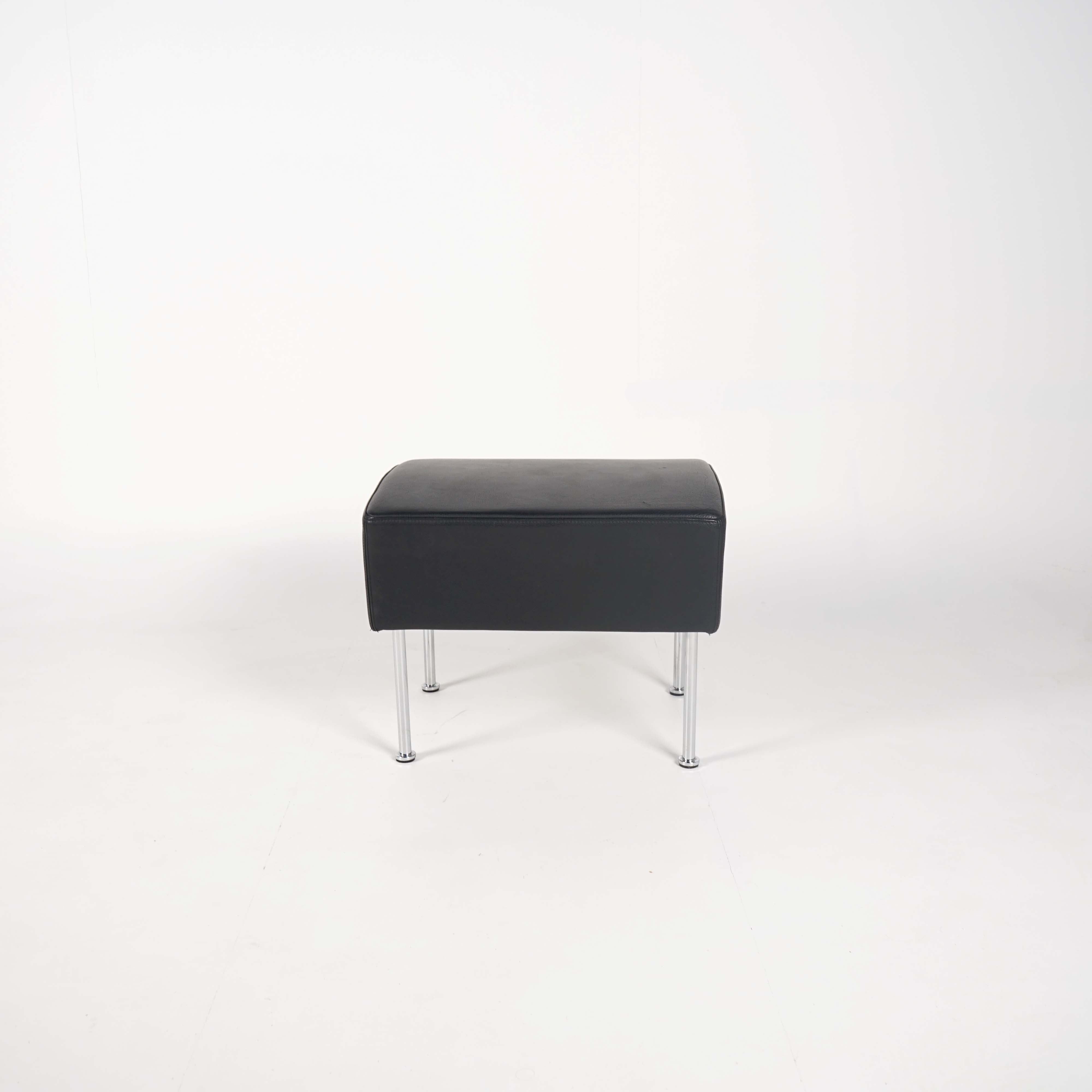 Ottoman eller puff fra Lammhults trukket i sort skinn. Med sitt pene og slanke design tar den lite plass, samtidig som den tilbyr god avlastning for føttene med sin faste form.