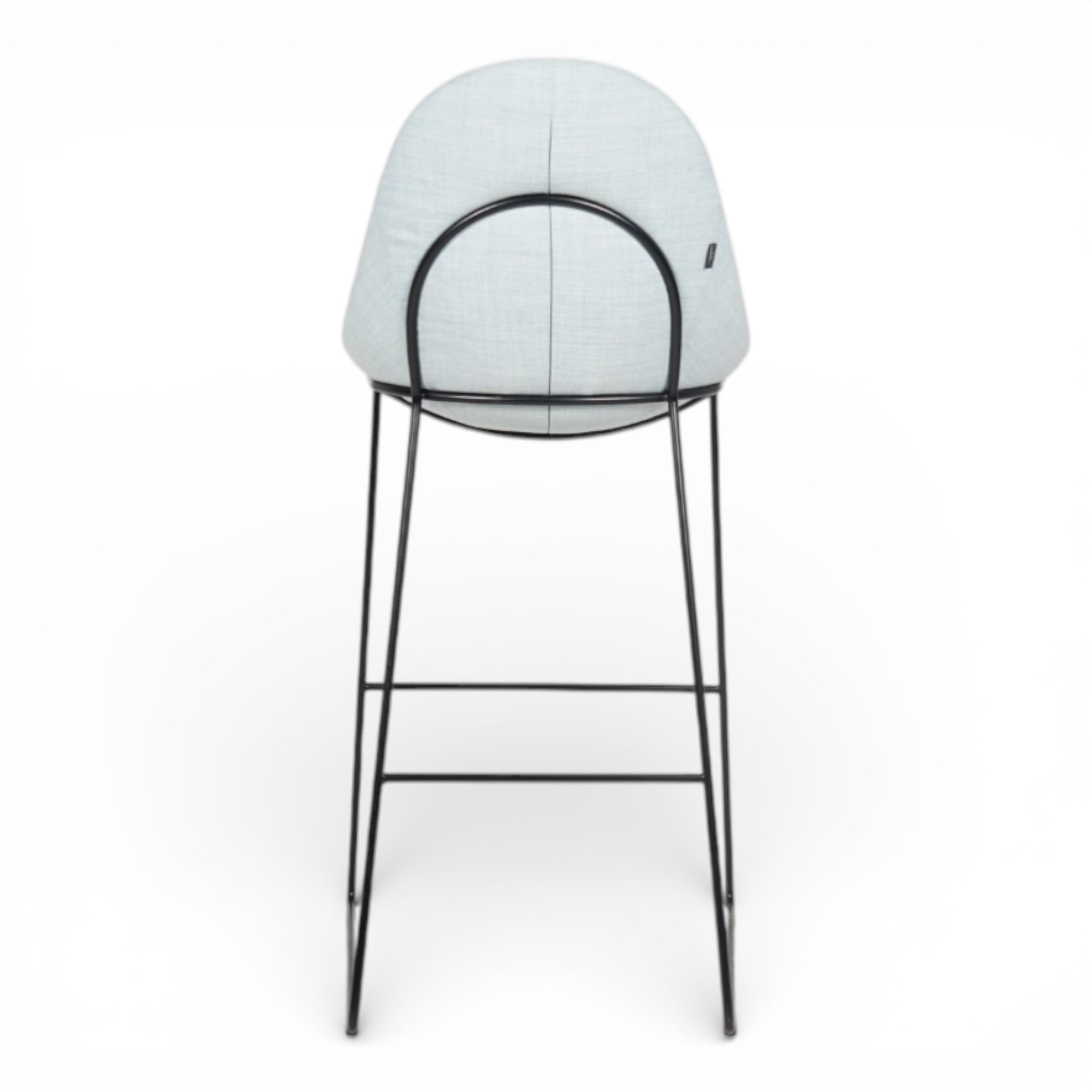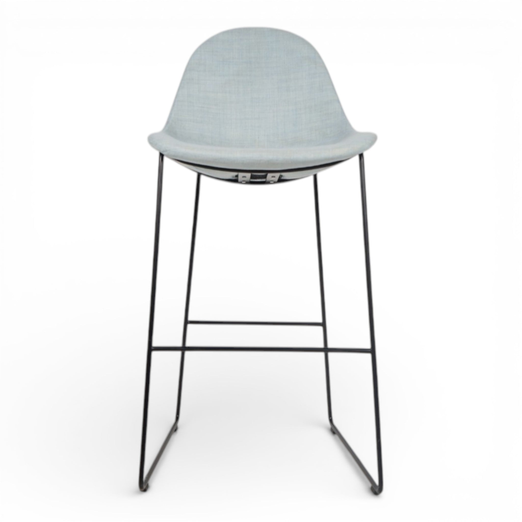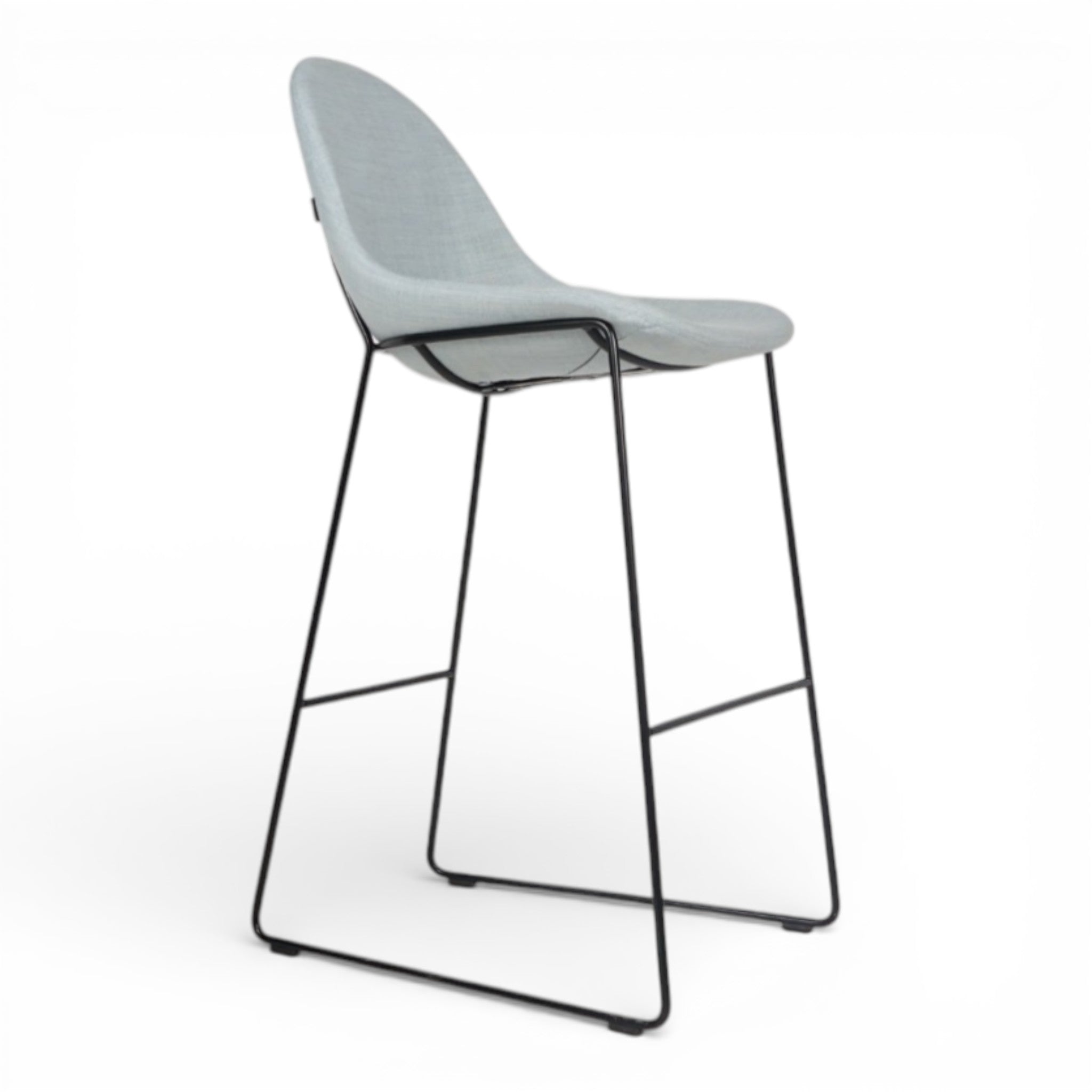 Barstol med stofftrekk i lyseblå farge. Stolen er utviklet for høyere sitteposisjon og passer til barer, høye bord og ståbord. Designet gjør stolen egnet for moderne kontormiljøer.