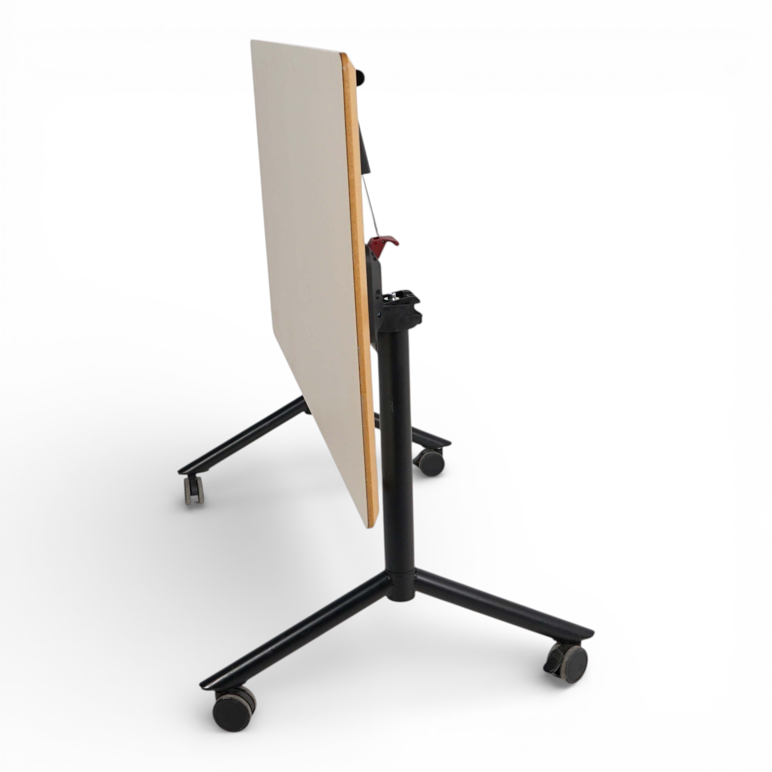 Lite og praktisk konferansebord med vippefunksjon. Bordene har hjul som kan låses. Dette gjør bordene svært fleksible å møblere med. Bena er sorte og platen er i en dempet gråbeige tone.