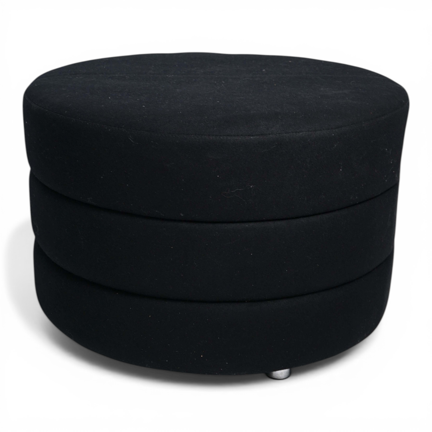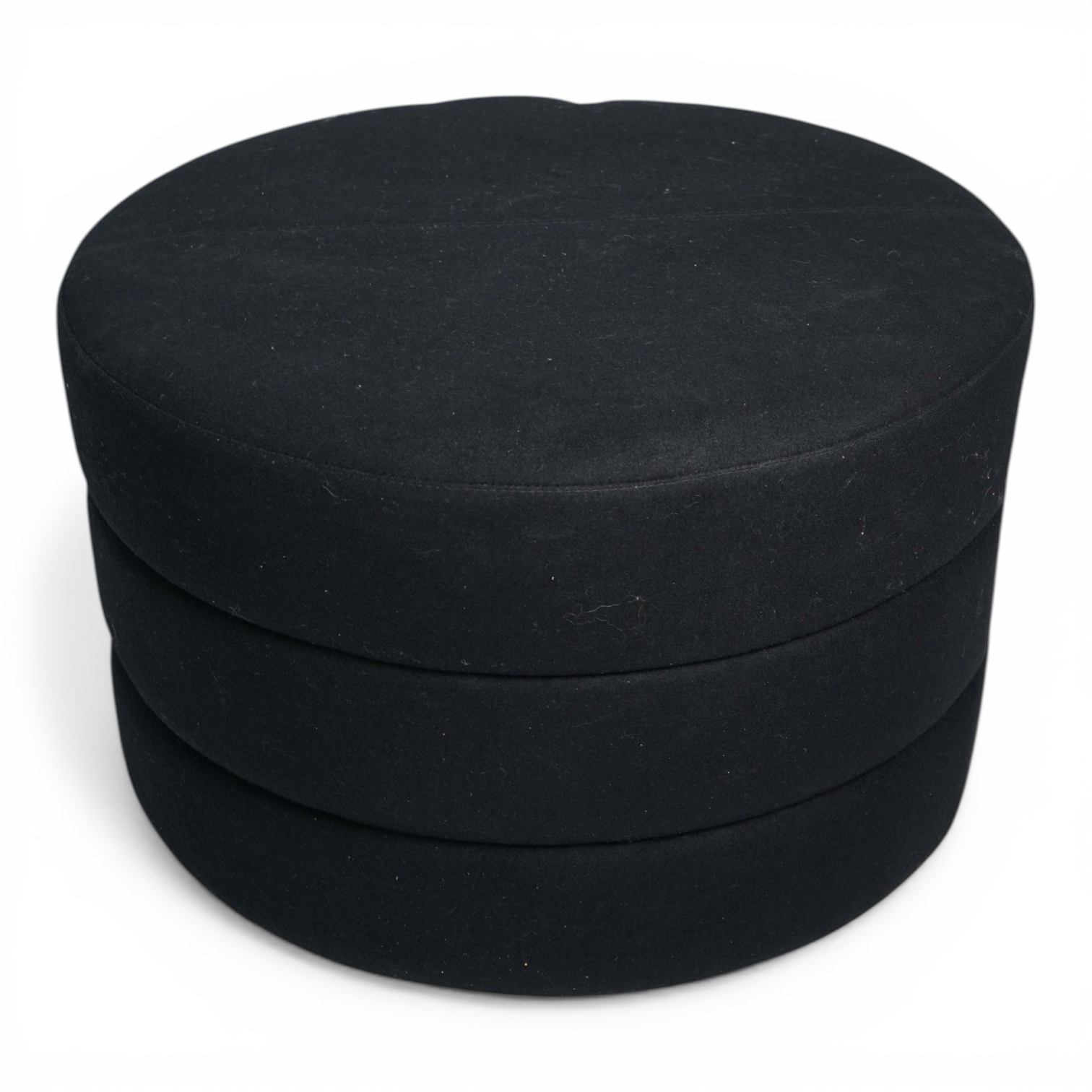 Rund puff i sort stoff med et særegent utseende. Puffen er fast og kan sittes på uten at man synker for langt ned i den.